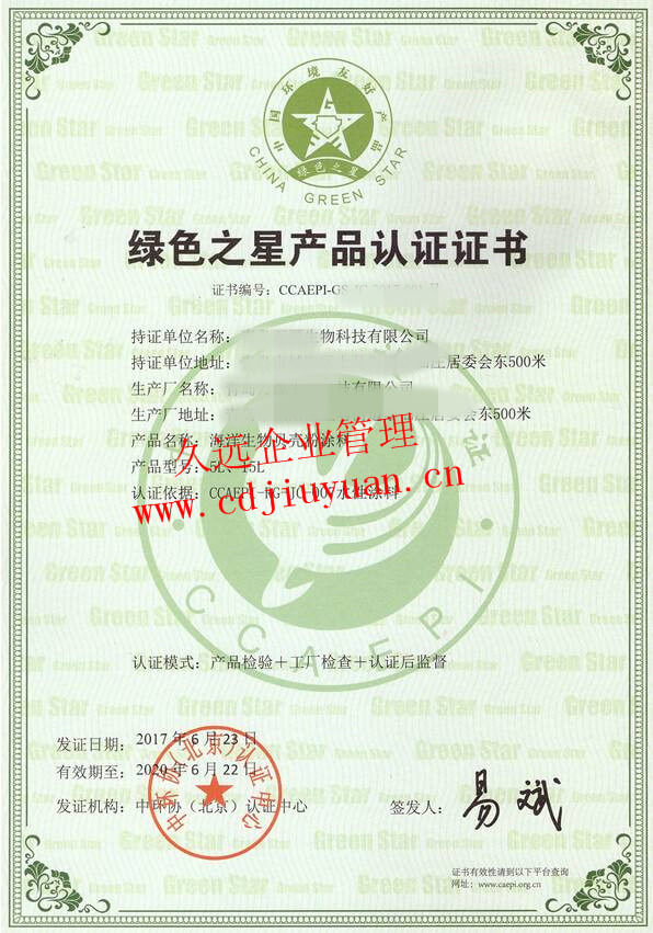 綠色之星產(chǎn)品認證證書